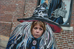 The witch permeates Salem's everyday life: At high school football games, the mascot wears a pointy black hat and sits atop a broom. The same image is emblazoned on police cruisers, and the witch rides the masthead of the local newspaper.