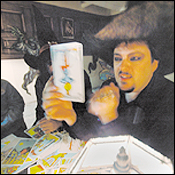 Prior to the mayor’s fund-raiser, Day sits in the decorated mall space amid the din of psychic readers and their clients at the festival’s Annual Psychic Fair and Witchcraft Expo. With his skull- and coffin-ringed fingers, he meticulously sews silver charms onto a black crushed velvet cape with thick black thread.